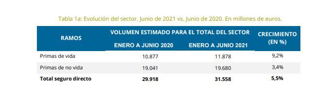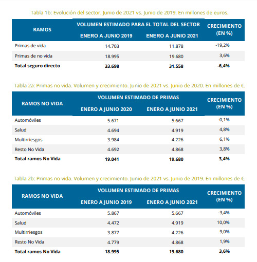 El Covid y las medidas que paralizaron la actividad económica del país hacen obligado mirar a 2019 para comparar verdaderamente los datos del sector asegurador hasta el primer semestre de este año. Con esta premisa, hasta junio el seguro cosechó un volumen total de primas de 31.558 millones de euros, lo que indica un crecimiento del 5,5% respecto al mismo periodo de 2020 y un 6,4% inferior a hace 24 meses verdadero espejo para verse, como resalta Unespa en el anuncio de los resultados.