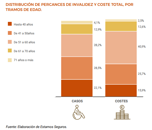 Según los datos recopilados por Unespa, la edad promedio a la que se percibe esta prestación en España es de 49 años y 3 meses. En torno a un 60% de la siniestralidad de invalidez, y un porcentaje mayor en el caso de los costes, se concentra en la personas entre los 40 y los 60 años. Las indemnizaciones tienden a ser más elevadas entre los asegurados que tienen entre 51 y 60 años. Por sexos, el 70% de los percances les ocurren a hombres, y el 30% a mujeres. La indemnización media en este caso apenas varía: 12.732 euros en el caso de los hombres y 12.512 en el de las mujeres.