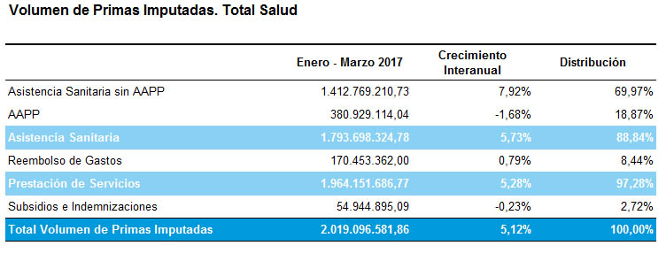 En cuanto al volumen de primas, en el periodo enero-marzo aumentaron un 5,12% hasta los 2.019 millones de euros. Con en el número de asegurados la modalidad de Asistencia Sanitaria sin AAPP mejoró un 7,9%, mientras que reembolso de gastos aumentó un leve 0,79%.