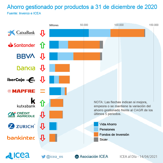 El ranking total por ahorro gestionado (en seguros de Vida, Pensiones, fondos de inversión y Sicav´s) lo lidera CaixaBank, que roza los 150.000 millones. Detrás se sitúan Banco Santander (unos 75.000 millones) y BBVA (alrededor de 70.000 millones). En esta clasificación hay dos aseguradoras: Mapfre, en sexto lugar, y Zurich, en el noveno.