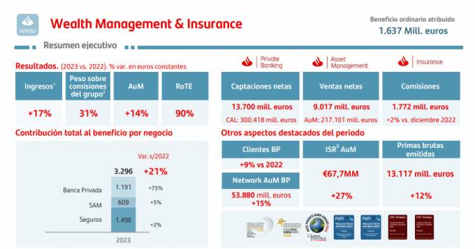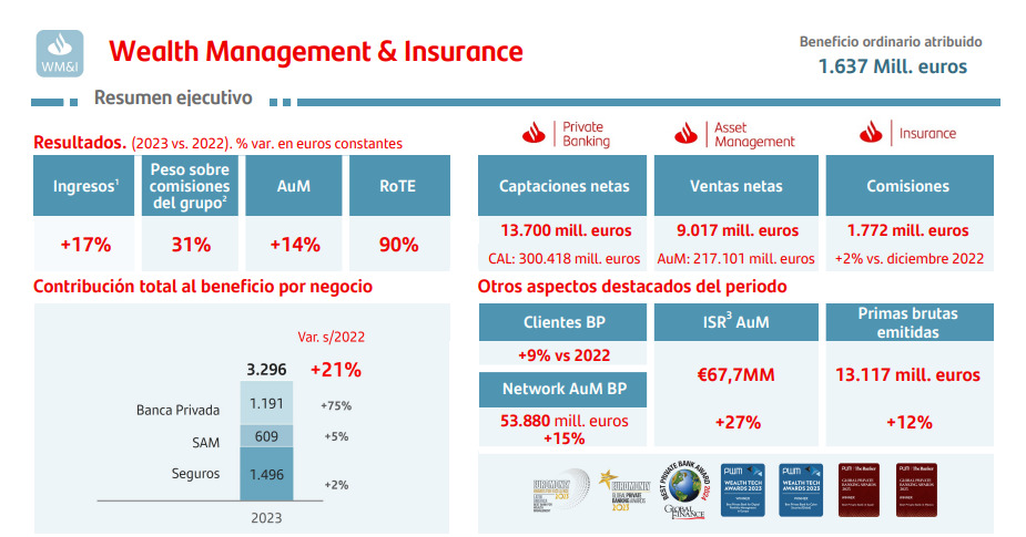 Santander ha presentado esta mañana sus resultados de 2023 en la CNMV donde notifica un beneficio de 11.076 millones de euros, un 15% superior al pasado año. En cuanto al negocio asegurador del banco, incluido en el apartado de Wealth Management & Insurance, la entidad notifica un volumen de primas brutas emitidas de 13.100 millones de euros, lo que muestra un avance del 12% respecto al pasado año, Así, las comisiones totales han crecido un 2% y su contribución total al beneficio se eleva hasta los 1.496 millones, un 2% superior al año anterior.