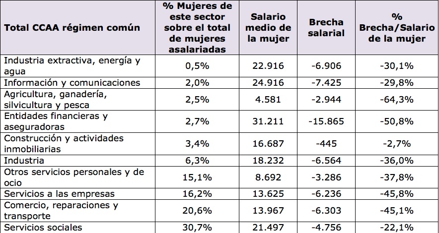 Así, los técnicos revelan que la mayor brecha en términos absolutos se da en la actividad financiera y aseguradora, donde a pesar de que las mujeres reciben sus mejores sueldos medios (31.211 euros brutos al año) cobran 15.865 euros menos que los hombres, o lo que es lo mismo, las mujeres tendrían que cobrar casi un 51% más para equiparar sus retribuciones con la de los hombres.