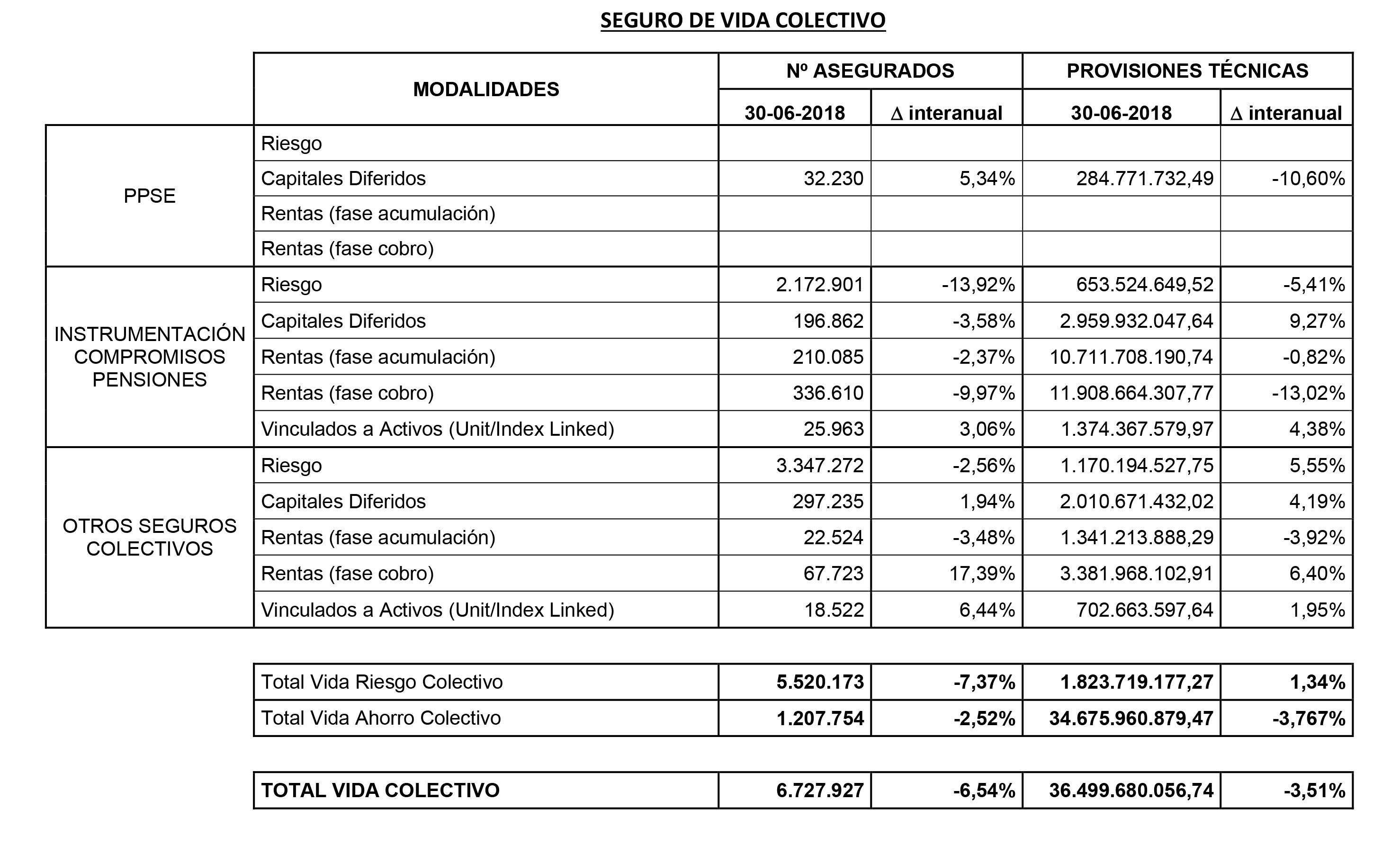 Las provisiones de Vida Colectivo suma hasta final del primer semestre 36.499 millones de euros. No sólo caen estas provisiones, el número de asegurados también ha mermado en el último año. Actualmente cuenta con 6,7 millones y una caída del 6,5%.