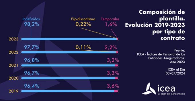 Al cierre de 2023, según los datos de ICEA, un 98,2% del personal en plantilla de las aseguradoras tenía contrato indefinido, lo que supone un 0,52% más que el año anterior. Mientras, "la tasa de temporalidad es una de las más bajas entre los diferentes sectores económicos en España, ya que la media de todos ellos fue del 17,1% de contratos temporales en 2023, 10,7 veces mayor que en seguros", añade.