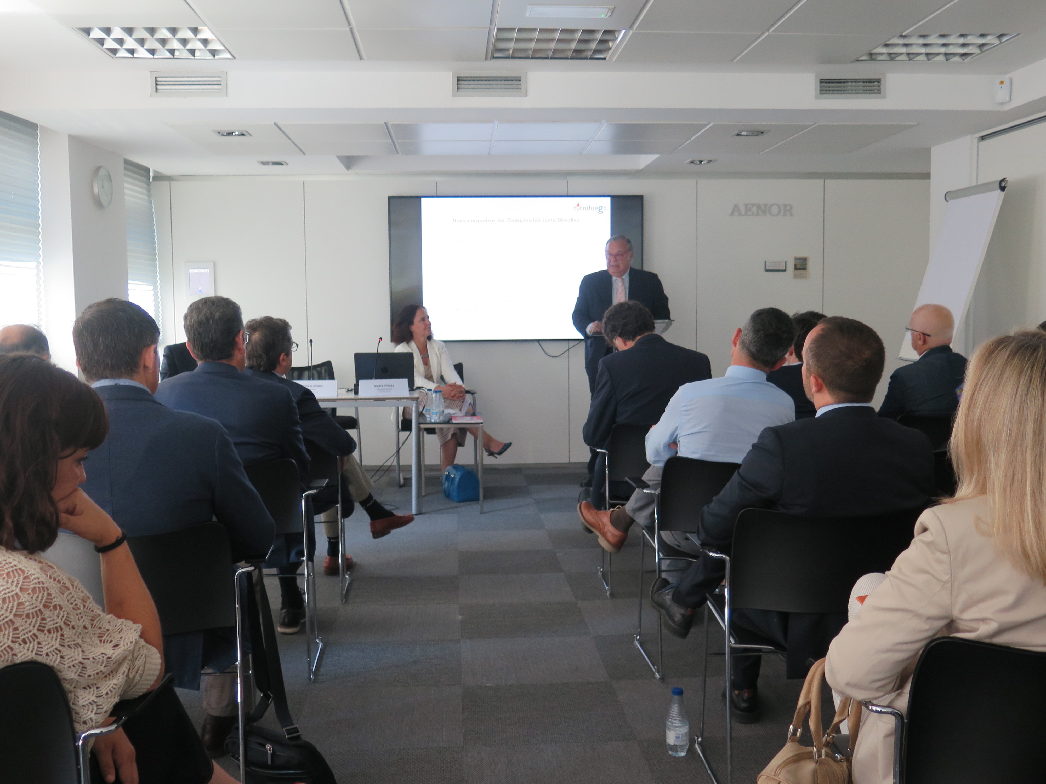 La asamblea ha contado con la presencia de José Carlos Pérez, jefe del Departamento de Seguridad, Accesibilidad y Proyectos Prestacionales del Área de Gobierno de Desarrollo Urbano Sostenible del Ayuntamiento de Madrid, y la UNE ha entregado una placa a Tecnifuego por su labor en materia de normalización.