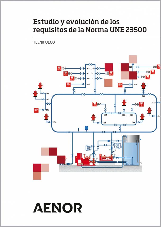 Tecnifuego ha impulsado el estdudio de Aenor 'Estudio y evolución de los requisitos de la norma UNE23500' de Sistemas de abastecimiento de agua contra incendios. Según reflejan, el libro está orientado a proporcionar "mayor claridad en los conceptos incluidos, ampliando detalles y comentarios que sin duda ayudarán a comprender los motivos y finalidades de cada apartado, así como a esclarecer los principales cambios introducidos".