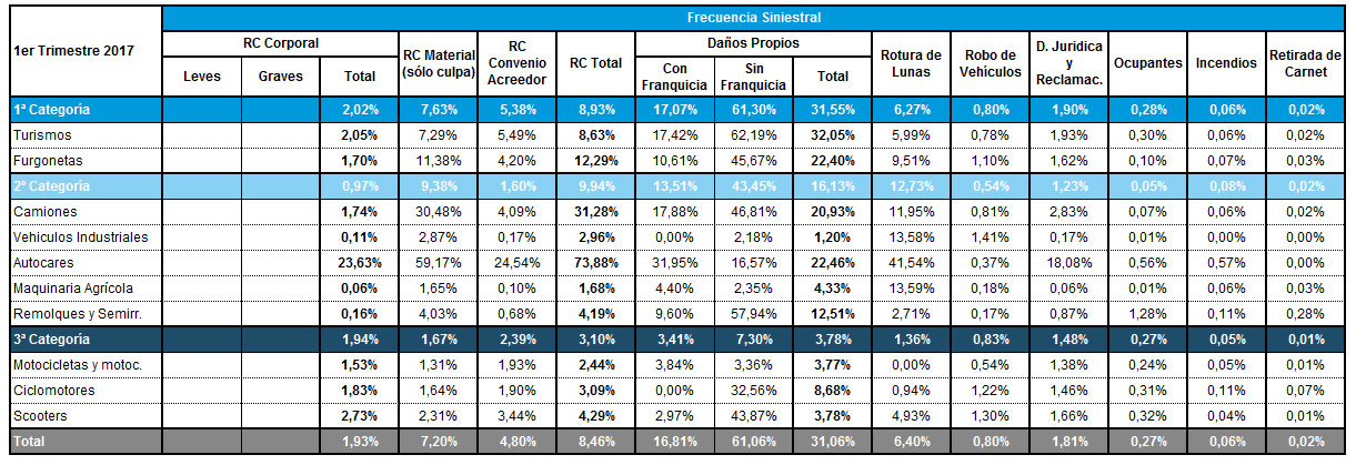 ICEA ha hecho públicos los datos de frecuencia siniestral hasta el primer trimestre del año del ramo de Autos. La primera conclusión es que el ramo no ha experimentado grandes diferencias respecto a marzo de 2016, a pesar de los temores del sector manifestadas en diversos foros.