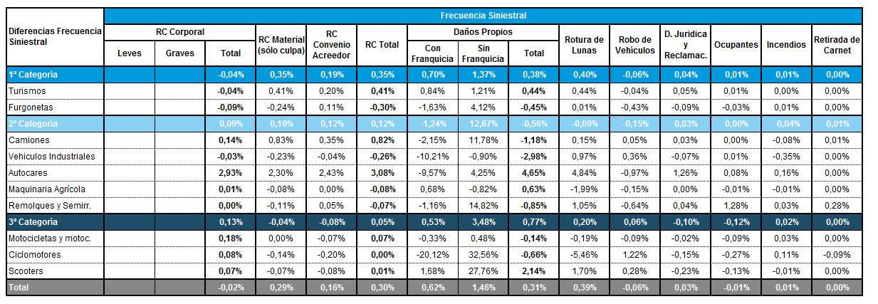 Una primera visión general comparado los datos de ambos trimestres indica que la modalidad que más sube son los Daños Propios sin franquicia con un 1,5%, seguido de los que sí tenían franquicia (+0,62%). Le sigue la rotura de lunas con el 0,4%. Las caídas de frecuencia siniestral son mínimas y dentro de ellas destacan los robos a vehículos (-0,06%) y la RC Corporal (-0,02%).