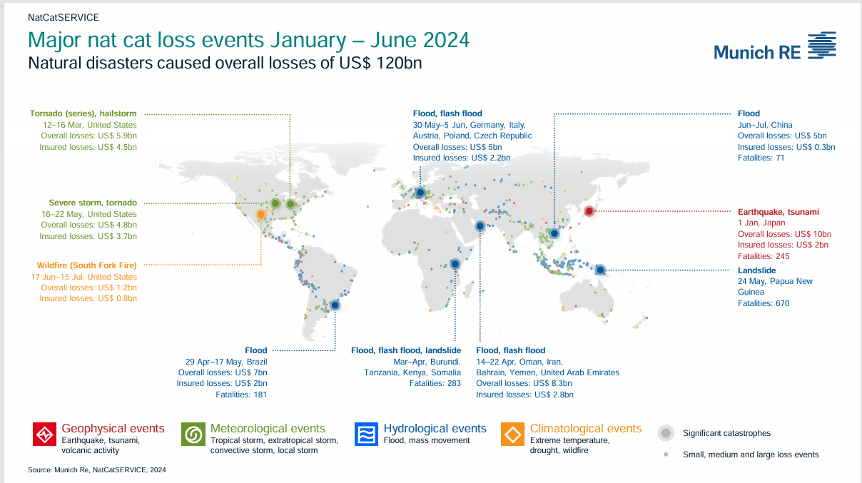 En números, esta reaseguradora sostiene que hasta el primer semestre de este 2024 las pérdidas globales se elevan hasta los 120.000 millones de dólares, un 14,2% inferior que el mismo periodo del pasado año. No obstante, sostiene la entidad que el pasado año se vio afectado por pérdidas extremadamente altas en relación con el grave terremoto en Turquía y Siria. Considera que "en una comparación a más largo plazo, las pérdidas totales en el primer semestre de 2024 superaron claramente los valores medios tanto de los últimos diez años como de los 30 años anteriores".