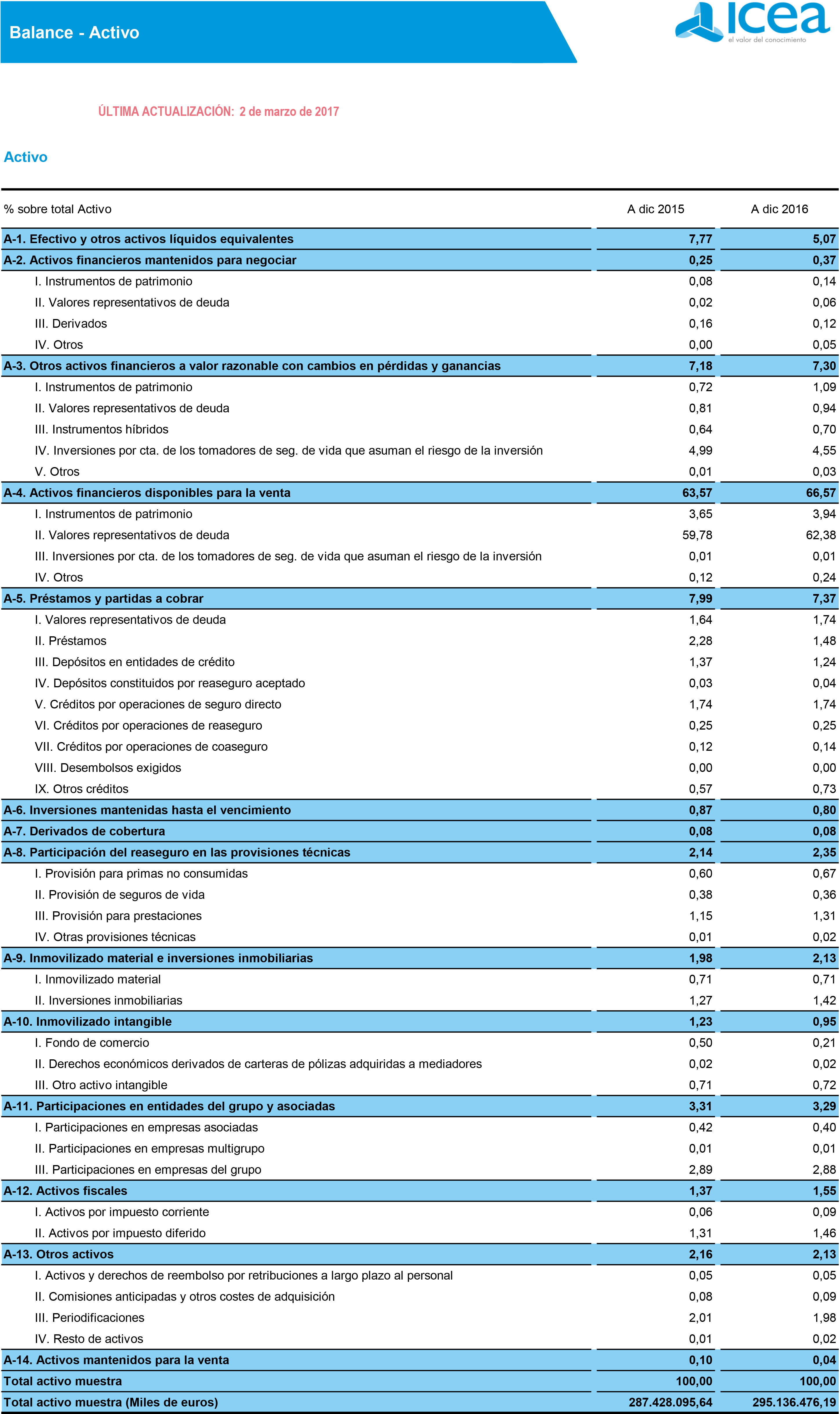 Los activos totales en balance del sector asegurador español alcanzaron en 2016 los 295.000 millones de euros, un 2,7% más que el año anterior. Son datos de ICEA actualizados a 2 de marzo que acaba de publicar y que forman parte del ‘Informe Económico del Sector Asegurador a diciembre. Año 2016’.