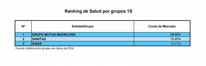 3 son los grupos destacados del sector español y muy superiores al resto. Los datos de ICEA del primer semestre señalan que Mutua Madrileña (SegurCaixa Adeslas) de manera muy destacada, Sanitas y Asisa cuentan con una cuota global de mercado hasta junio del 57,17% frente al 54,91% que tenían en marzo. Aun así, estos datos son inferiores al cierre de diciembre cuya cuota de los tres se elevaba por encima del 59%.