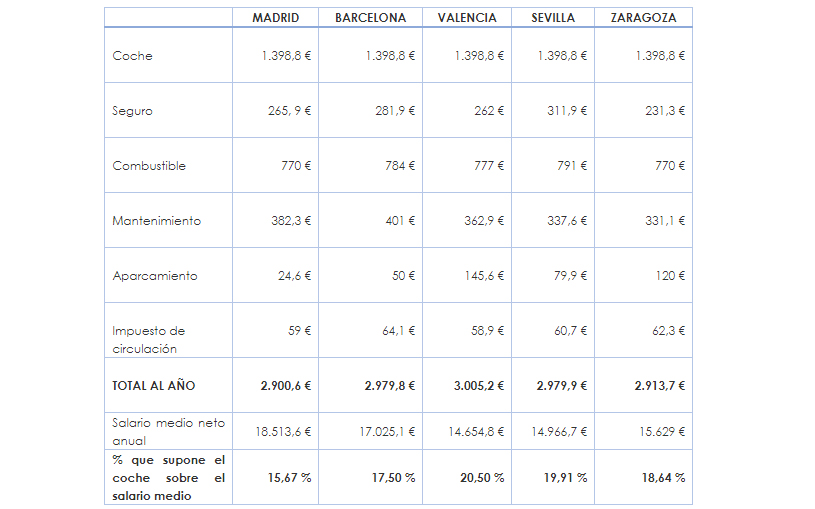 De los 3.005 euros, 1.398,8 corresponden a la letra anual del coche –según la Agencia Tributaria, comprar un automóvil nuevo cuesta 16.786 euros de media con el impuesto de matriculación incluido y el estudio ha repartido esa cantidad en 12 años, la edad media de un vehículo en España−; 262, a la prima del seguro; 777, al gasto en combustible –teniendo en cuenta que recorra 10.000 km al año y el precio se mantenga a 1,11 euros el litro−; 362,9, al mantenimiento; 145,6, al aparcamiento –es el máximo a pagar por estacionar en zona naranja en Valencia−; y 58,9, al impuesto de circulación establecido por el Ayuntamiento de la localidad.
