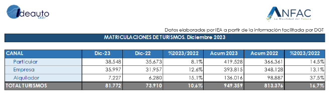 Las ventas de turismos han cerrado el ejercicio 2023 con un alza del 16,7%, sumando 949.359 unidades. Destaca el buen mes de diciembre con un aumento del 10,6%, hasta las 81.772 unidades. Según Anfac, que ha proporcionado esta información, el dato es positivo si se tiene en cuenta que la financiación sigue elevada y que la inflación todavía no se ha controlado a los niveles que tenía antes de la escalada de conflictos bélicos a nivel internacional.