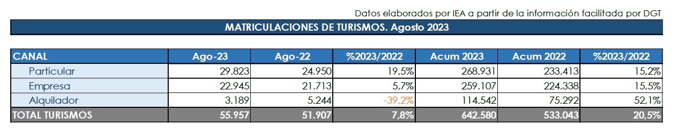 El crecimiento registrado en agosto viene impulsado, principalmente, por las ventas a particulares y empresas. Ambos canales registran un aumento del 19,5% y del 5,7% de las ventas, con un total de 29.823 unidades dirigidas a particular y de 22.945 a empresas. Por su parte, el mercado dirigido al canal de alquiladores sufre un importante descenso del 39,2%, hasta las 3.189 unidades. Esta baja demanda se explica debido a que las alquiladoras realizan sus compras en los meses previos a la campaña turística del verano.