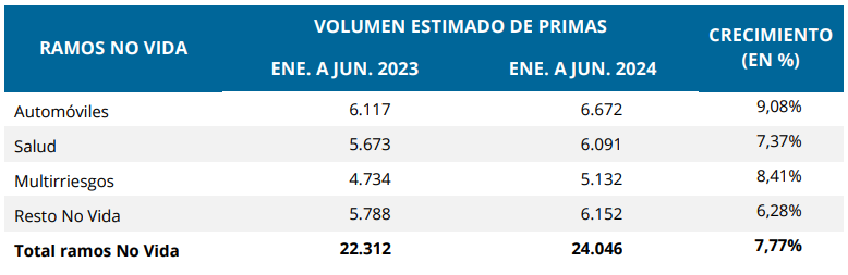 Los 24.046 millones restantes corresponden, por tanto, a No Vida, un segmento que sigue creciendo con fuerza (+7,7%) pero que no puede compensar toda la caída de Vida. En el primer semestre, los 4 principales negocios de No Vida siguen registrando un excelente comportamiento. El que más ha crecido es Autos, que ha incrementado un 9,08% su facturación, elevándola hasta los 6.672 millones.
