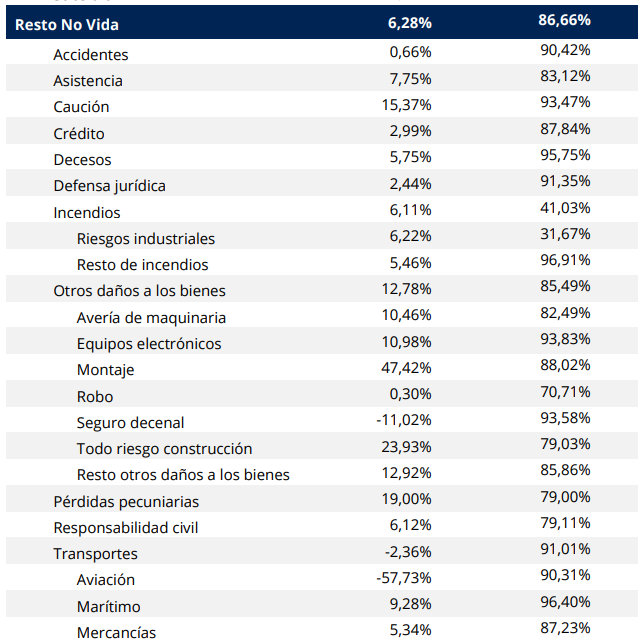 Detallando el Resto de No Vida, solamente han decrecido 2 negocios aseguradores: Seguro decenal (-11,02%) y Transportes (-2,36%). Los demás han aumentado su recaudación, especialmente los siguientes: Montaje (+47,42%), Todo riesgo construcción (+23,93%), Pérdidas pecuniarias (+19%) y Caución (+15,37%).