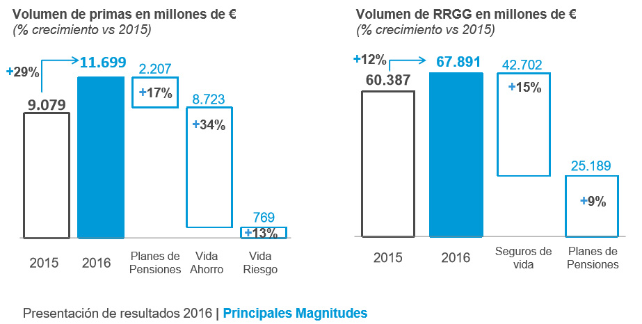Por su parte, la compañía cuenta con una recursos gestionados, entre Planes de Pensiones y Seguros de 67.891 millones, con una mejora del 12% en relación a 2015. Aquí el crecimiento mejor fue para los seguros de Vida, con un incremento del 15% hasta los 42.702 millones; los Planes de Pensiones aportaron 25.189 y una mejora del 9%. En ambos casos el crecimiento está por encima del mercado que registra avances del 6% y del 2,2%, respectivamente.