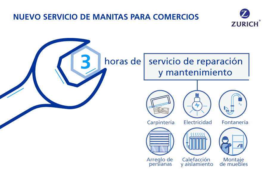 Zurich está actualizando su gama de productos y ha incorporado nuevas prestaciones en sus seguros para comercios y comunidades de vecinos. En lo que respecta a comercios, dispondrán del servicio de manitas dirigido a la reparación o mantenimiento de electricidad, fontanería y carpintería. Incluye 3 horas gratuitas de trabajo al año por parte de un profesional.