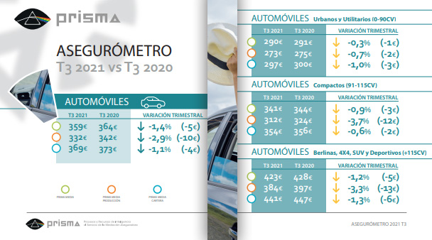 producción, la prima media fue de 332 euros (-2,9%), lo que equivale a 10 euros menos por póliza. "La cartera ha tenido un comportamiento estable, con una variación que fue desde los 373 euros del tercer trimestre de 2020 a los 369 del mismo periodo de 2021, lo que representa un 1,1% menos, que equivale a 4 euros menos por póliza", indica.