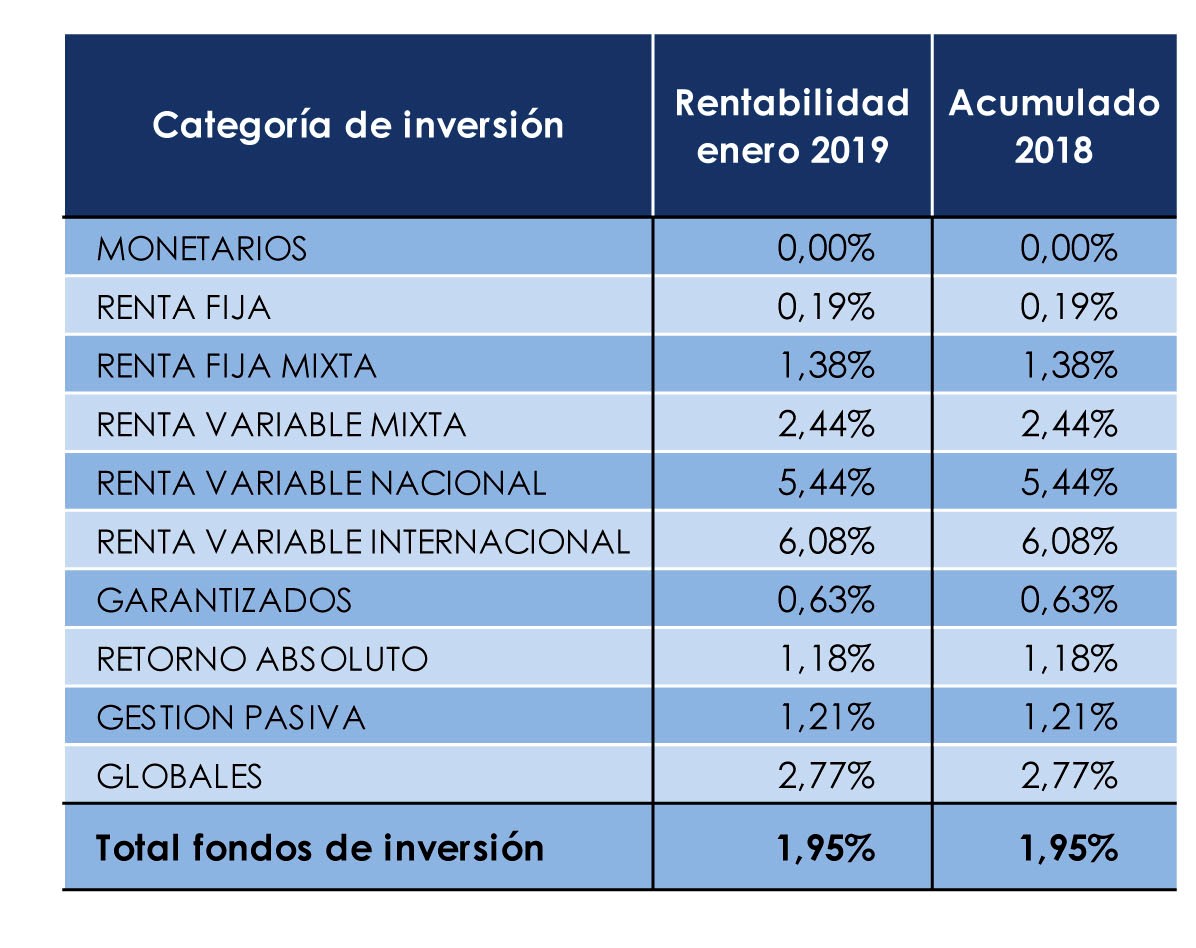 Todas las categorías cerraron el primer mes del año en positivo, en especial aquellas con mayor exposición a acciones. La Renta Variable Internacional registró una rentabilidad media superior al 6%, al igual que la Renta Variable Nacional, que cerró con rendimientos superiores al 5%.