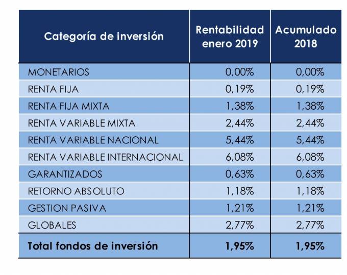 "Enero se caracterizó por el buen comportamiento de los mercados de acciones, tras los notables ajustes del mes anterior. La volatilidad se ha reducido notablemente, y los rendimientos positivos se han generalizado entre la mayoría de los índices bursátiles", recuerda Inverco. En ese contexto, los fondos de inversión registraron en enero una rentabilidad positiva del 1,95%, recuperando el ajuste del 1,90% de diciembre.