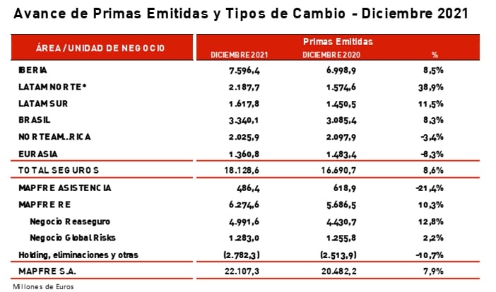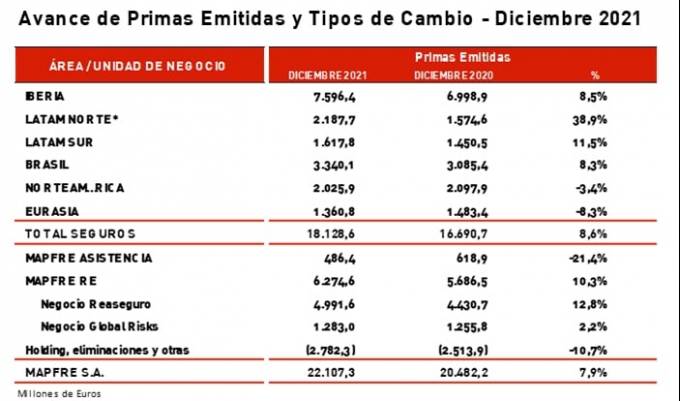 Mapfre ha publicado un avance del volumen de primas obtenido en 2021, desglosado por regiones y unidades de negocio. Este adelanto lo da a conocer antes de la presentación oficial de los resultados del pasado ejercicio, prevista para el próximo 10 de febrero.