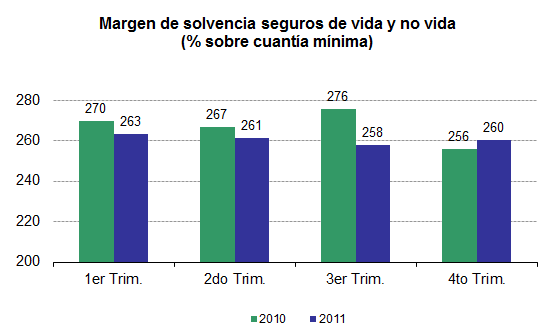 Al finalizar 2011, el margen de solvencia de las aseguradoras españolas se situó en 2,6 veces la cuantía mínima legal. Este margen es el patrimonio propio no comprometido del que disponen las aseguradoras para hacer frente a las posibles consecuencias económicas no previstas de sus actividades. En Vida, el margen se situó en el 189% sobre el mínimo, y en No Vida fue del 353%, aunque tanto el cálculo como la composición del margen son diferentes para cada tipo de negocio, según señala ICEA.