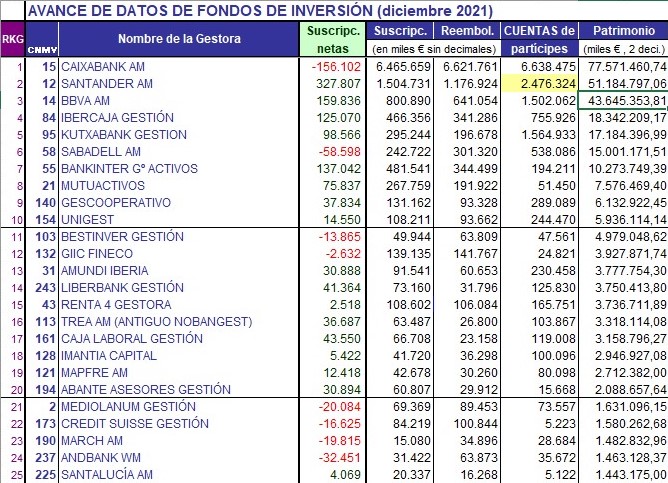 Mutuactivos y Mapfre AM han acabado el año 2021 entre las 20 mayores gestoras de fondos de inversión de España por patrimonio acumulado, según datos provisionales facilitados por Inverco. En concreto, Mutuactivos se ha situado en la 8ª posición, con un patrimonio que asciende a 7.576.469,40 millones de euros, y Mapfre AM ocupa el 19º puesto con un patrimonio de 2.712.382 millones. Ambas han estado en los puestos nobles de la tabla a lo largo de todo el ejercicio.