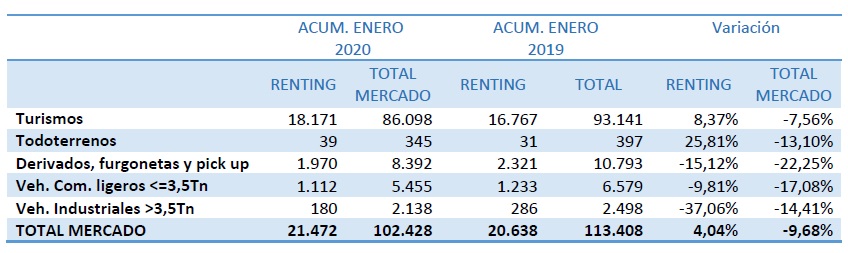 El peso del renting en el total del mercado en enero supone ya casi el 21%